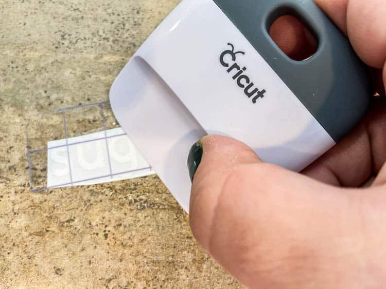 Selon la taille des étiquettes, découpez votre bande de transfert à la bonne dimension, puis retirez le film protecteur. Posez-la bien à plat sur chaque mot en vinyle et utilisez le grattoir pour assurer une parfaite adhésion du lettrage au film. Recommencez pour chaque nouvelle étiquette.
